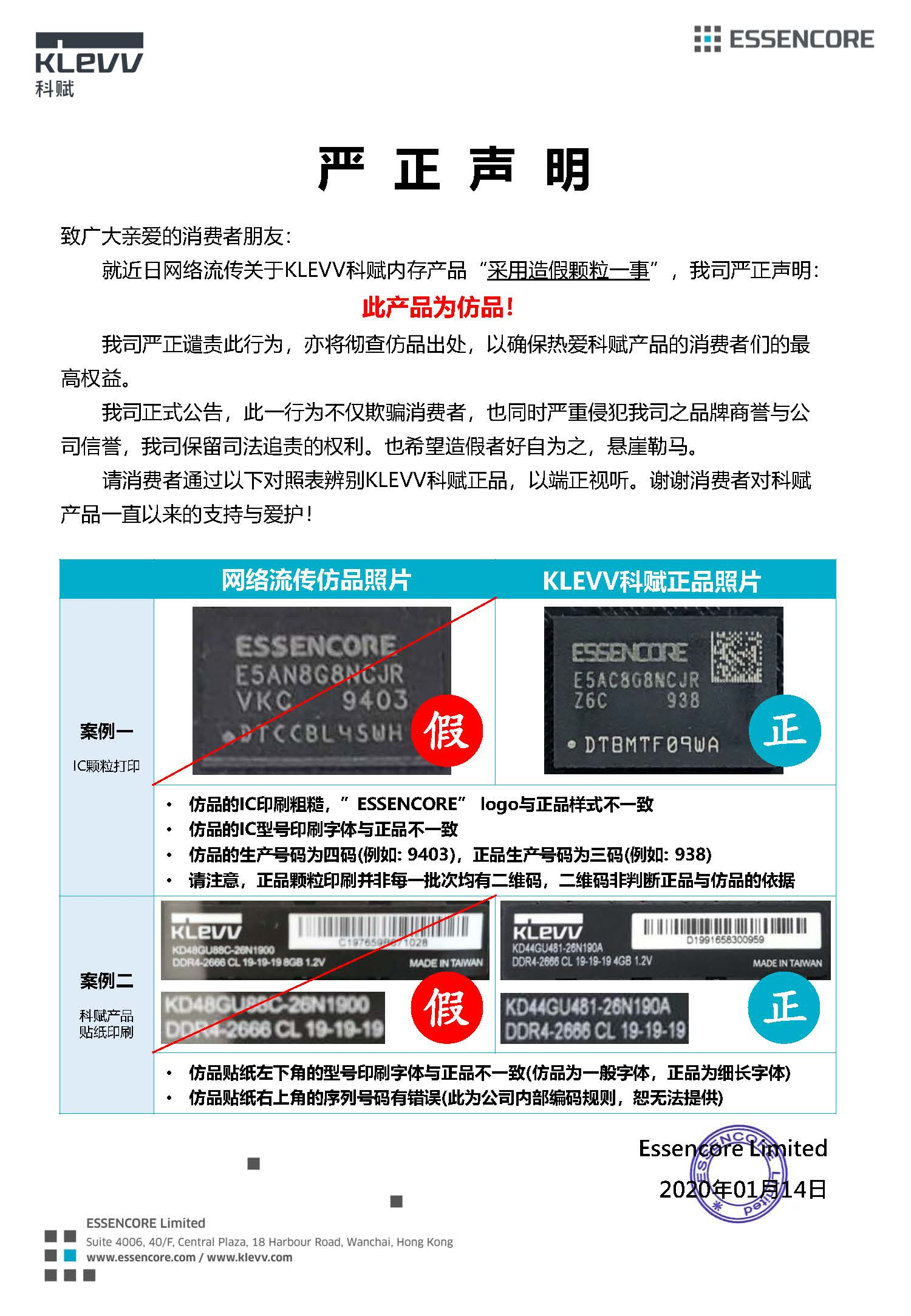 全球内存及存储领导品牌爱思德(ESSENCORE),旗下消费品牌KLEVV科赋,近日宣布正式在本月为旗下受市场欢迎的热销超频内存——科赋CRAS X RGB和科赋 BOLT X,推出更高的新频率組合3600MHz版本,并提供单支包与双支包的多元组合,为用户带来全新的内存条极速效能体验。 科赋 CRAS X RGB 超频内存——炫彩照亮你的生活  科赋 CRAS X RGB 超频内存——炫酷与极速双重的体验 科赋CRAS X RGB沿袭科赋经典CRAS系列的精致与优雅,完美相容于ASUS华硕、MSI微星、GIGABYTE技嘉、 ASROCK华擎、 Razer雷蛇的RGB控制软件,拥有精雕细琢的散热马甲与水晶造型导光条,不规则的水晶宝石导光条,让RGB光线能从不同角度多元散射,让RGB流光效果强化升级。科赋CRAS X RGB 曾荣获2019德国红点设计大奖的产品设计奖。采用纯铝打造外覆散热片,最大限度提升热传导性,即使超频运行也不用担心内存过热,满足超级用户的全方位需求。 产品规格一览:类型 :288 Pin DDR4 无缓冲内存 (U-DIMM)速度频率:3200MHz, 3600MHz容量组合:8Gx1, 8Gx2, 16Gx1, 16Gx2电压:1.35V延迟时序:16-18-18-38, 18-22-22-42RGB支持:ASUS AURA SYNCMSI Mystic Light SyncGIGABYTE RGB Fusion 2.0ASROCK POLYCHROME RGBRAZER CHROMA尺寸:133.5 x 51 x 8 mm保固声明: 终身有限保固 科赋 BOLT X 超频内存——如闪电般迅捷  科赋 BOLT X超频内存——风驰电掣般疾速体验 科赋BOLT X系列超频内存,主打FAST LIKE A BOLT,如闪电般迅捷。采用特殊纹样设计的铝制散热马甲,将传热效果最大化,最大限度地提升热传导性,即使超频运行也不用担心内存过热。支持Intel XMP (Extreme Memory Profile) 2.0 一键超频功能,同时通过各大主板厂QVL认证测试,可兼容于各大主流主机板平台。采用经先进半导体技术制造并严选的内存芯片, 经过层层测试把关,仅选用最佳效能的内存模组,让你在游戏世界里体验如风驰电掣般疾速。 产品规格一览:类型:288 Pin DDR4 无缓冲内存条 (U-DIMM)速度频率:3200MHz, 3600MHz容量组合:8Gx1, 8Gx2, 16Gx1, 16Gx2电压:1.35V延迟时序:16-18-18-38, 18-22-22-42尺寸:133 x 33 x 5 mm保固声明:终身有限保固 科赋在本月为热销款产品CRAS X RGB/ BOLT X 推出新频率组合3600MHz,可谓是为广大游戏发烧友/电竞玩家、高端图片/影音编辑工作者带来的一大福音。科赋CRAS X RGB/ BOLT X 3600MHz版本,将助力用户轻松玩转3A级游戏大作,轻松满足4K分辨率高画质影音编辑需求,为用户开启全新的极速体验之旅。    除既有代理商业蓝海星河科技有限公司,KLEVV科赋亦透过富基电通香港股份有限公司代理销售。呼吁消费者购买时请认明正品以维护自身权益。 关于Essencore爱思德爱思德由一群半导体与内存的业界精英所组成,其目标是成为全球的领导内存及存储装置供货商。公司的核心目标旨在“改变世界,成为半导体界的领导者”。爱思德采用最先进的技术、结合核心专业人才,以期提供消费者最专业、优异、与多样化的内存产品。 关于KLEVV科赋科赋KLEVV是爱思德旗下的高阶消费性存储品牌,提供的产品范围涵盖内存、存储卡、存储U盘及SSD固态硬盘等产品。科赋致力于提供世界一流品质的产品,所有产品均在韩国研发设计。科赋的内存产品也先后荣获 2015及2019年德国红点设计大奖。